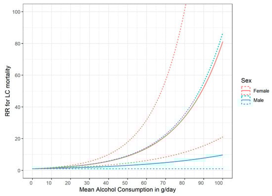 Relative risk for liver cirrhosis mortality as a function of mean alcohol consumption (based on [43]). RR: Relative Risk; LC: liver cirrhosis; solid lines denote point estimates, dashed lines the 95% confidence intervals.