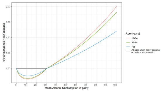 Age: There are biological and other reasons that dose–response curves for alcohol use should change with age. However, the underlying literature is scarce. Ischemic disease categories are an exception. Klatsky found an attenuation of risk based on age [45]. Based on this, the dose–response curves for ischemic disease were modelled separately for three age groups [46]. Figure 2 gives an example. As these curves also depend on the frequency of HEDs (see above and [21]), different curves are provided. For people without any history of HED, there are potential beneficial effects at up to 30 g/day average consumption, and these effects are most pronounced in younger ages (see the curve in red versus the curves in green or blue). For people with HED, the curve is flat until it reaches 30 g/day average consumption (black line), with no beneficial or detrimental effects, irrespective of age. After that threshold is reached, the curves are the same irrespective of any history of HED [46].