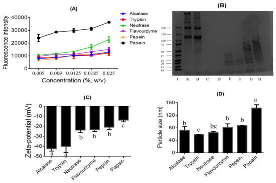 Properties of the collagen protein hydrolysates. (A) Surface hydrophobicity (H0), (B) SDS-PAGE protein profile, (C) zeta potential, and (D) mean particle size of the collagen hydrolysates produced by Alcalase, trypsin, Neutrase, Flavourzyme, pepsin and papain. Mean values with different letters in (C) and (D) are significantly different with p < 0.05. SDS-PAGE label: Lanes I: High molecular-weight protein marker, A = Acid-solubilized collagen (ASC), B = Pepsin-solubilized collagen (PSC), and collagen hydrolysates obtained using C = trypsin, D = Alcalase, E = Flavourzyme, F = Neutrase, G = pepsin, and H = papain.