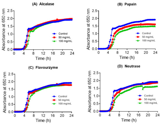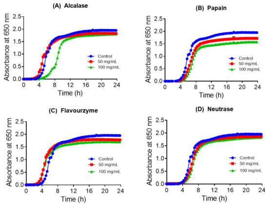 Growth curves of E. coli in the absence (control) and presence of collagen hydrolysates produced with four enzymes (A) Alcalase, (B) papain, (C) Flavourzyme, and (D) Neutrase. Experiments were conducted three times, and each data point represents the mean value.