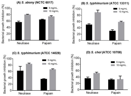 Fractionation using acetone increased the specific activity of inhibitory substances in most samples. After 6-h incubation, the acetone fractions of hydrolysates produced with Neutrase and papain exhibited the highest and dose-dependent anti-Salmonella growth inhibitory activities (Figure 4). In contrast, fractions from hydrolysates produced with Alcalase and Flavourzyme showed less potency against the four Salmonella strains (data not shown). Neutrase produced the hydrolysate with the most potent activity against the four Salmonella strains, with the highest growth inhibition of 90% observed at 10 mg/mL against S. typhimurium ATCC 13311.