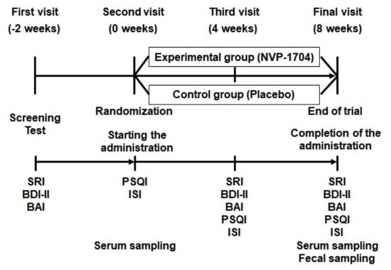 The present study aimed to examine the efficacy and safety of NVP-1704 administration for the management of stress-related symptoms, such as depression, anxiety, and insomnia, in healthy adults. To overcome the methodological shortcomings of previous studies, we conducted a randomized, double-blind, placebo-controlled parallel study with a relatively large sample size, and included a gut microbiome analysis to confirm the effects of our intervention.