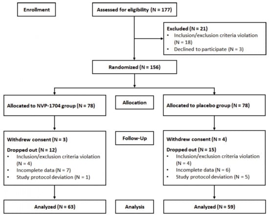 At the first visit, demographic, medical, and anthropometric data were gathered, and electrocardiogram, blood cell count, biochemistry profile, and urinalysis were conducted for each participant. At the second visit, two weeks after the first visit, eligible participants were randomly assigned in a 1:1 ratio to either the experimental group receiving the probiotic NVP-1704, or the control group receiving a placebo. The random assignment was performed via the block randomization method, using SAS version 9.4, and both participants and investigators were blinded to the treatment conditions. Participants received either the probiotic NVP-1704 or a placebo depending on their randomized group assignment, and intervention began immediately. They were instructed to take two capsules with water once a day, daily, for eight weeks. The third and final visits took place at four and eight weeks after initiation of intervention, respectively. Treatment compliance was assessed twice over the study period by counting the remaining capsules at the last two visits. Figure 1 describes the timeline of the study protocol.