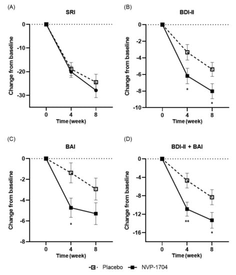 Effects of NVP-1704 on mood parameters such as SRI score (A), BDI-II score (B), BAI score (C), and the sum of BDI-II and BAI scores (D). Scores are shown as 4- and 8-week mean changes from baseline during the study period. Independent t-tests were performed. Data values are described as the mean ± standard error of the mean. Asterisks indicates a statistically significant difference between the two groups (* p < 0.05, ** p < 0.01). SRI, Stress Response Inventory; BDI-II, Beck’s Depression Inventory; BAI, Beck’s Anxiety Inventory.