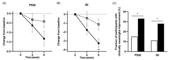 Effects of NVP-1704 on sleep parameters such as the PSQI score (A), ISI score (B), and the fraction of subjects with improvements in PSQI and ISI scores (C). Scores are shown as 4- and 8-week mean changes from baseline during the study period. The improvement is defined as a score reduction above or equal to the minimal clinically important difference for each scale. Independent t-tests were performed for analysis of the PSQI and ISI scores. Chi-squared tests were performed for the comparison of the fraction of participants with improvement. Data values are described as means ± standard errors of the mean. Asterisks indicates a statistically significant difference between the two groups (* p < 0.05, ** p < 0.01). PSQI, Pittsburgh Sleep Quality Index; ISI, Insomnia Severity Scale.