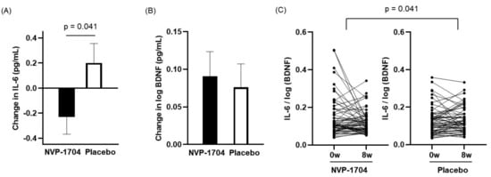 Effect of NVP-1704 on blood levels of IL-6, BDNF, and the ratio of IL-6 to log (BDNF). (A) Changes in the level of IL-6 and (B) log (BDNF) in serum from baseline to 8 weeks of treatment. (C) The ratio of IL-6 to log (BDNF) as individual values at each time point in the NVP-1704 and placebo groups. IL-6, interleukin-6; BDNF, brain-derived neurotrophic factor.