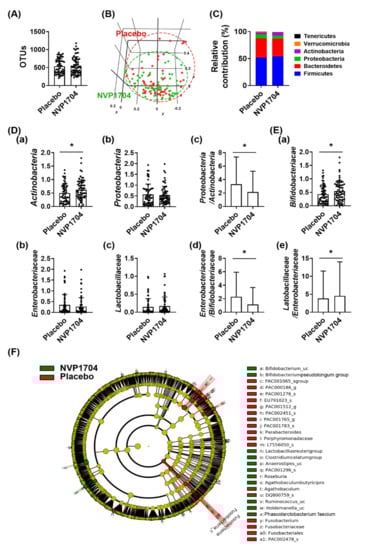 Effects of NVP-1704 on the gut microbiota composition. Effect on the α-diversity (estimated operational taxonomic units, OTUs) (A) and β-diversity (principal coordinate analysis [PCoA] plot based on Jansen-Shannon) (B). Effects on gut bacteria composition at the phylum (C) and cladogram (F) generated by linear discriminant analysis effect size indicating significant differences in gut microbial abundances. (D) Effect on the Actinobacteria (a) and Proteobacteria populations (b) and their ratio (c) at the phylum level. (E) Effect on the Bifidobacteriaceae (a), Enterobacteriaceae (b) and Lactobacillaceae populations (c) and as their ratio, Enterobacteria per Bifidobacteriaceae (d) and Lactobacillaceae per Enterobacteriaceae (e) at the family level. The composition of Actinobacteria, Proteobacteria, Bifidobacteriaceae, Enterobacteriaceae, and Lactobacillaceae populations was indicated as log (composition percent + 1). Data indicate mean ± standard deviation. * The significance was analyzed by one-tailed Mann–Whitney test (p < 0.05).