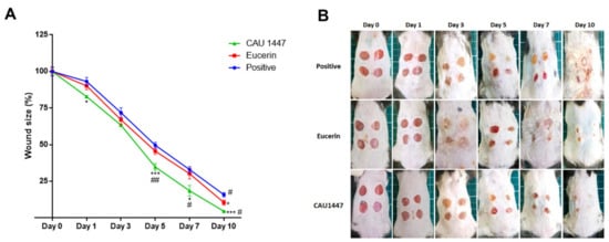 Full-thickness excisional circular wounds were created using a 6 mm biopsy punch of five mice from each group. To evaluate the changes in excisional wound size, a digital caliper was used to calculate the wound size at 1, 3, 5, 7, and 10 days after each injury. The proportion of wound closure was measured at each time point by calculating the unclosed wound area and representing it as a proportion of the initial wound area. The percentage of wound closure in all groups was calculated for days 1, 3, 5, 7, and 10 post wounding. As shown in Figure 1A, after day 3, there was a significantly sharper decline in mean wound size in the CAU 1447 group compared with the other groups (Figure 1A). From days 5 to 7, respectively, the wound size reduction rates were higher in the CAU 1447 group than the positive group (day 5, p = 0.0007; day 7, p = 0.0134) and the Eucerin group (day 5, p = 0.0073; day 7, p = 0.0414). Until day 10, the CAU 1447 group had the smallest mean wound size relative to those of the positive (p = 0.0001) and Eucerin (p = 0.0164) groups. This is reflected in the representative wound-size images taken after day 3 and shown in Figure 1B.