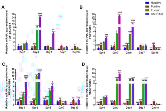 We examined differences in relative growth factor mRNA expression levels that were associated with wound healing acceleration. The mean TGF-β1 mRNA expression level of the CAU 1447 group was significantly higher than that of the positive group on day 1 (p = 0.0211). Thereafter, the mean TGF-β1 level of the CAU 1447 group significantly increased relative to those of the positive (day 3, p < 0.0001; day 5, p = 0.0018) and Eucerin (day 3, p < 0.0001; day 5, p = 0.0017) groups until day 5 (Figure 4A). In terms of the mean FGF mRNA levels, until day 5, the CAU 1447 group had the same level as the positive (day 1, p < 0.0001; day 3, p < 0.0001; day 5, p < 0.0001) and Eucerin (day 1, p = 0.0003; day 3, p < 0.0001; day 5, p < 0.0001) groups (Figure 4B). Furthermore, until day 5, the CAU 1447 group had the highest mean PDGF level relative to those of the positive (day 1, p < 0.0001; day 3, p < 0.0001; day 5, p < 0.0001) and Eucerin (day 1, p < 0.0001; day 3, p < 0.0001; day 5, p = 0.0167) groups (Figure 4C). In terms of the mean VEGF mRNA expression, from day 1 to day 7, the CAU 1447 group had significantly higher levels than the positive (day 1, p < 0.0001; day 3, p < 0.0001; day 5, p < 0.0001; day 7, p < 0.0001) and Eucerin (day 3, p = 0.0004) groups (Figure 4D). Due to the late expression in the positive group, the mean relative mRNA level in the CAU 1447 group was similar or lower than that of the positive group on day 7 and day 10.
