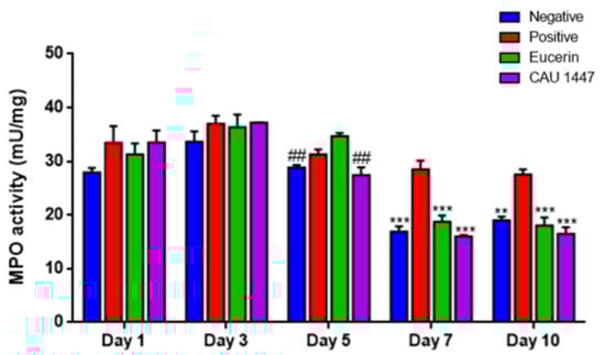 The myeloperoxidase (MPO) analysis was conducted to confirm the changes in enzyme activity after the application of Eucerin and CAU 1447 ointments. On day 5, the mean MPO activity level of the CAU 1447 group was significantly lower than that of the Eucerin group (p = 0.0016). After that, until day 10, the mean MPO activity level of the CAU 1447 group declined significantly relative to that of the positive group (day 7, p = 0.0002; day 10, p = 0.0003). Additionally, the CAU 1447 group had a lower mean MPO activity level than the Eucerin group, but this difference was not statistically significant (Figure 5).