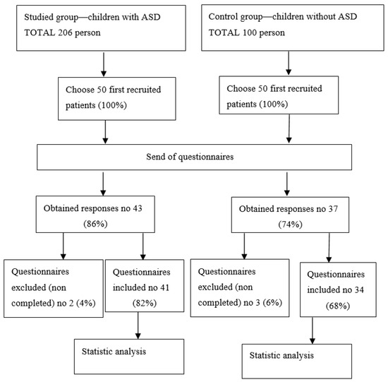 We obtained 43 (86%) questionnaires from the ASD group and 37 (74%) questionnaires from the control group. Some of the questionnaires were not completed in both groups, which resulted in 2 of them being excluded from the ASD group and 3 of them being excluded from the control group. The rest of the questionnaires, i.e., 41 (82%) from the study group and 34 (68%) from the control group, were submitted to the statistical analysis (Figure 1).