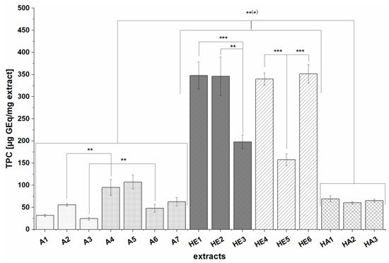 TPC (total phenolic content) of extracts expressed in units of µg GEq/mg extract. Values are expressed as means ± SD of three to five independent experiments each performed in triplicate; significant differences between and within different extract groups were analyzed: ** p < 0.01, *** p < 0.001.
