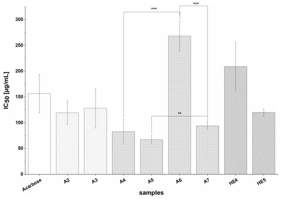 The α-glucosidase-inhibiting potential of the 16 BSG extracts was investigated using the potent inhibitor Acarbose (whose measured IC50 value was 156.7 ± 37.3 µg/mL) as a positive control. Extracts A2-A7 and HE4-HE5 exhibited strong inhibition of the enzyme, with IC50 values ranging from 67.4 ± 8.1 µg/mL to 268.1 ± 29.4 µg/mL (Figure 3). The other extracts (A1, HE1-HE3, HE6, HA1-HA3) caused only slight (data not shown) or no inhibition and their IC50 values could not be calculated. In general, most extracts prepared by solid-liquid extraction with 60% acetone (A) showed inhibitory activity, whereas only two HE extracts (prepared by alkaline treatment followed by ethyl acetate extraction) and no HA extracts (prepared by alkaline treatment followed by extraction with 60% acetone) were strong inhibitors. Additionally, extracts prepared from BSG 2 by solid-liquid extraction with 60% acetone (A4, A5) were significantly stronger inhibitors of α-glucosidase than comparable A extracts from BSG 3 (A6, A7) (p < 0.01 and p < 0.001). A extracts prepared from defatted material (A5, A7) showed stronger inhibition than those prepared from untreated (non-defatted) BSG samples (A4, A6); this difference was statistically significant when comparing A6 and A7 (p < 0.001).