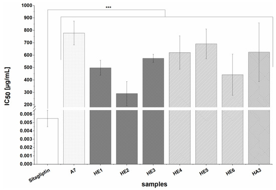 A fluorometric method using Sitagliptin (in the form of 100 mg Januvia) as a positive control was used to investigate the effects of the BSG extracts (except A2) on DPP IV. The positive control agents resulted in a very low measured IC50 value of 5.5 ± 1 ng/mL. All tested extracts inhibited DPP IV at the highest tested concentration of 1 mg/mL. Extracts HE1-HE6 prepared by alkaline hydrolysis and A7 and HA3 (prepared from defatted raw material) strongly inhibited the enzyme, with IC50 values ranging from 290.6 ± 97.4 to 778.4 ± 95.5 µg/mL, as shown in Figure 4. All extracts had significantly (p < 0.001) higher IC50 values than the positive control. Extracts A1 and A3-A6 (prepared by solid-liquid extraction with 60% acetone) and HA1 and HA2 (prepared by acetone extraction of alkaline hydrolysis residues) exhibited slight to moderate inhibition, reducing DPP IV activity by 15.2 ± 4.1 to 49.5 ± 4.4% at a concentration of 1 mg/mL (data not shown). In general, it was mainly HE extracts which showed potent inhibition, whereby the biological relevance has to be evaluated critically due to the potent inhibition of the diabetes drug Sitagliptin.