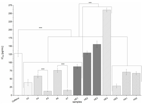 IC50 values for the inhibition of GPα by extracts (A3-A7, HE1-HE5, HA1-HA2) and the positive control (PC) agent caffeine. Values are expressed as means ± SD of three independent experiments and 20 for the PC, each performed in triplicate; significant differences between extracts and PC and within and between extraction groups are denoted as follows: *** p < 0.001.