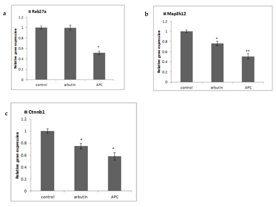 As presented in Table 1, APC up-regulated the Prkar1b gene, which codes for the protein that is a regulatory subunit of cyclic AMP-dependent protein kinase A (PKA) [29]. As previously reported, APC treatment inhibits the Mitf expression [28], which could be due to the inhibition of signals that are upstream of Mitf. In short, an inactivation of PKA and the down-regulation of cAMP due to APC treatment could explain the decreased Mitf expression. Down-regulation of Mitf also led to inhibition of melanosome transport by its direct regulatory effect on Rab27a expression [30]. In this study, Rab27a expression was down-regulated by 51.7%. In addition, it has also been observed that β-catenin was down-regulated. β-catenin, as a transcriptional regulator, can be redirected by MITF away from genes that are under the regulation of the Wnt signaling toward Mitf-specific targets [31]. Additionally, β-catenin is also known to regulate Mitf expression [32]. β-catenin may be degraded via a ubiquitin-dependent, PKA-attenuated GSK3β (glycogen synthase kinase-3β) action [24]. MITF-regulated gene Rab27a, in addition to its function in melanosome transport, also has a significant role in various cell activities that include cell growth, invasion, and metastasis [33,34]. Several studies have associated increased expression of Rab27a with carcinogenesis, and it has been reported to promote the stemness of colon cancer cells [35], leading to poor survival in pancreatic cancer [36]. The inhibition of Rab27a by APC therefore suggests an anti-cancer effect of APC by targeting Rab27a.