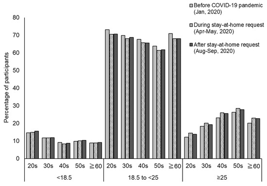 3.5. Distribution of Body Mass Index before the COVID-19 Pandemic, and during and after Stay-at-Home Request Period in the Extended Group