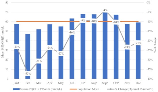 Weighted mean S-25(OH)D (nmol/L)/month of test and percentage of change from the optimal level (75 nmol/L) using Cycles 3 and 4 of Canadian Health Measures Survey data († reference value * significant at p ≤ 0.05).