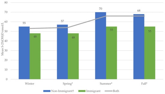 Weighted seasonal variation in mean S-25(OH)D (nmol/L) based on immigration status using Cycles 3 and 4 of Canadian Health Measures Survey data († reference value * significant at p ≤ 0.05).