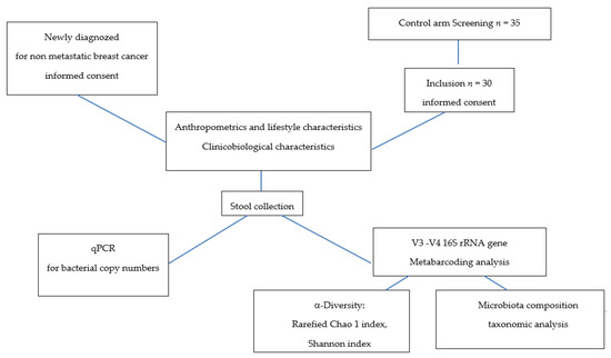 This study included 30 healthy women controls (no pathology declared, no current medication except contraceptives or menopausal hormone therapy) and 25 BC patients before any anticancer therapy was started. Patients had been referred to our hospital (ICO René Gauducheau, Saint-Herblain, France) for early-stage BC. All medications well known to impact microbiota were considered to be exclusion criteria (such as antibiotics or gastrointestinal drugs). For all participants, we recorded age; weight; size; menopausal status; lifestyle, such as smoking and alcohol consumption; oral contraceptives; and menopausal hormone therapy. For patients, we also included the type of BC, the histo-prognostic grade, the clinical stage, and the tumour localization and size. Informed consent was obtained from patients and control women to use their biological specimens and clinicopathological data for research purposes, as required by the French legislation (CRB-Tumorothèque–ICO, France) [11]. Figure 1 describes the design of the study.