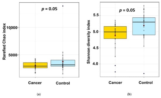 It is a common knowledge that species diversity of a bacterial community is characterized by both species’ richness and evenness [26]. In the present study, we observed a lower but nonsignificant richness of gut microbiota in patients versus that of controls using the Chao1 index. However, we observed a significant loss of diversity in BC patients compared to that of healthy controls when using the Shannon index; this index includes both richness and evenness. Our results are in agreement with previously published case control data with postmenopausal women that showed the same lower diversity in a cohort with the same characteristics, even if the authors found a significant difference for Chao1 and a nonsignificant difference for the Shannon index [18]. A reduction in intestinal bacterial diversity has already been reported in other cancers (e.g., colorectal) and other pathologies (e.g., inflammatory bowel disease, obesity, and autism) [3,18,27,28,29].