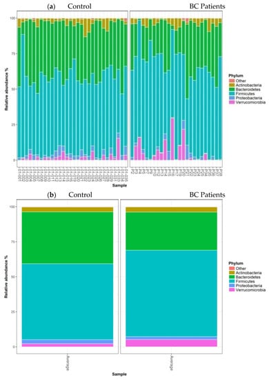 The barplots of relative abundances at phylum levels for individual data (a) or means per condition (b) are presented in Figure 3. The relative abundances at the phylum level expressed as mean (SEM) in the control group vs. BC group were 3.40% (0.51) vs. 3.62% (0.56); 2.89% (0.37) vs. 2.13% (0.41); 2.23% (1.05) vs. 5.15% (1.15) for Actinobacteria, Proteobacteria, and Verrucomicrobia, respectively. According to this taxonomic analysis at the phylum level, we found that Firmicutes were the most predominant phylum in both groups, with a significantly higher relative abundance in patients 61.64% (1.99) compared to controls 54.19% (1.81) (FDRpadj = 0.03, FDRpnonadj = 0.01). In contrast, the Bacteroidetes phylum was significantly more abundant in healthy controls than in BC patients, accounting for 36.98% (1.84) and 27.19% (2.02), respectively (FDRpadj = 0.03, FDRpnonadj = 0.005) (Figure 3b).