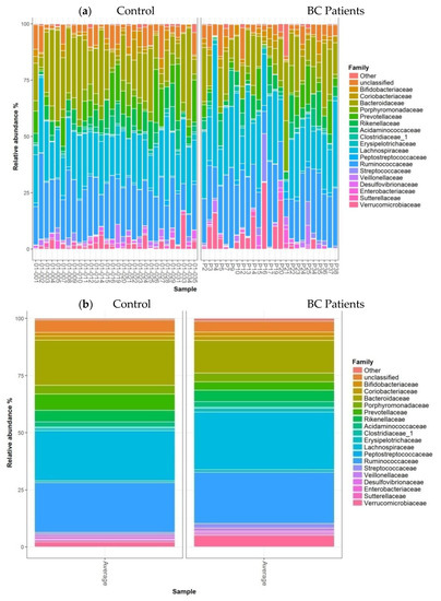 Clostridium cluster IV and cluster XIVa were in a higher relative abundance in the BC group (12.02% (9.33–21.56) vs. 6.1% (3.63–11.91) p = 0.003) and 18.64% (10.94–22.43) vs. 5.97% (4.02–15.59); p = 0.012), respectively. At the genera level, the relative abundance of Blautia was significantly higher in the BC group compared to that of controls.