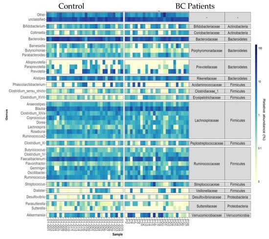 The heatmap of relative abundances at the genus level is presented Figure 5. Among bacterial genera, Coprococcus (Firmicutes), Odoribacter, and Butyricimonas (Bacteroidetes) were found in less relative abundance in breast cancer patients compared to that of controls (1.36% (0.29) vs. 2.84% (0.27) FDRpadj = 0.11, FDRpnonadj = 0.007; 0.14% (0.04) vs. 0.30% (0.04), FDRpadj = 0.07, FDRpnonadj 0.003and 0.1% (0.05) vs. 0.32% (0.04), FDRpadj = 0.07, FDRpnonadj 0.003, respectively). Conversely, Clostridium XVIII and Lachnospira (Firmicutes) were in a higher relative abundance in BC patients (0.77% (0.11) vs. 0.3% (0.10), FDRpadj = 0.11, FDRpnonadj 0.008; and 1.23% (0.17) vs. 0.58% (0.16), FDRpadj= 0.08, FDRpnonadj 0.003).