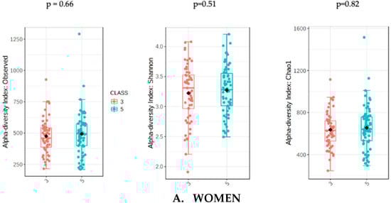 Richness measured as observed counts (left), Shannon diversity (middle) and Chao1 index (right), categorized according to the consumption of UPFs adjusted by BMI, age and energy intake for women (A) and men (B). Men who consumed more than 5 UPFs showed significantly lower richness and alpha diversity. Orange boxes represent women (A) and men (B) who consumed less than 3 serv/d of adjusted UPFs, and blue boxes represent the group that consumed more than 5 serv/d of adjusted UPFs.