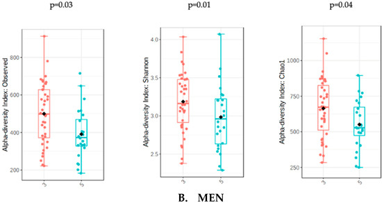 The analysis of microbiota was evaluated with the sum of UPFs consumption (serv/d) adjusted by BMI, age and energy intake in order to avoid potential confounders. The analysis of gut microbiota richness between subjects who consumed less than 3 servings/day of UPFs and more than 5 showed no significant differences in the whole population (p = 0.31) and in women (p = 0.51). However, men who consumed more than 5 serv/d of UPFs showed a significant lower richness value compared to men who consumed less than 3 (p = 0.01). The analysis of alpha diversity in the whole population showed no significant differences when evaluated by Shannon (p = 0.61) and Chao1 (p = 0.38). Similarly, no significant differences in alpha diversity were found in the female subpopulation using Shannon (0.82) and Chao1 (p = 0.66). However, the men who consumed more than 5 serv/d of UPF presented a significantly lower alpha diversity when assessed by Shannon (p = 0.04) and Chao1 (p = 0.03) indexes (Figure 1).