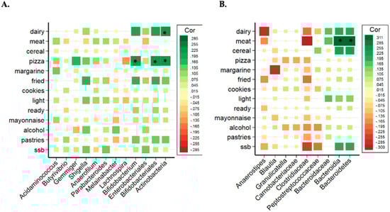 Due to the distinctive results of the microbiota analysis, the relationship between bacterial taxa and the consumption of the different groups of ultra-processed products were studied separated by sex. Figure 2A,B show the correlation between groups of UPF with the significant bacteria found in all women and men (without categorizing by adjusted UPF consumption). In women, the consumption of industrially processed dairy products and pizza showed a positive and strong association with Bifidobacterium, Bifidobacteriales and Actinobacteria (class and phylum). However, the correlation matrix showed different results in men (Figure 2B), where Bacteroidia (class) and Bacteroidetes (phylum) presented a significant positive correlation with industrially processed meat consumption.