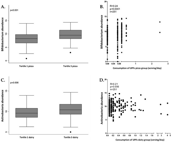 Box plot of differences in Bifidobacterium abundance according to tertiles of ultra-processed pizza consumption (A) and the correlation analysis (B) in women. Box plot of differences in Actinobacteria abundance according to tertiles of ultra-processed dairy consumption (C) and the correlation analysis (D) in women. The Y axis represents the relative bacterial abundance and the X axis represents the tertiles 1 and 3 of UPFs consumption. Only shown Bifidobacterium genus in association with pizza consumption due to the similarities with Bifidobacteriales and Actinobacteria. Differences between tertiles were assessed by Mann-Whitney test.