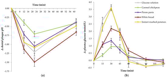 In Study 2, the different starch-containing carbohydrate foods were chosen to represent common carbohydrate staples that vary in their GI, texture, and nutritional composition. As hypothesized, foods that produced lower postprandial glycemic responses also elicited smaller dental plaque pH excursions. The smaller plaque pH nadir may reflect the slower rate of digestion of carbohydrates observed with lower GI foods [,,], resulting in less acid production after fermentation by oral bacteria. The intact nature of the whole canned chickpeas [] and the protein-starch matrix found in pasta [] are both factors known to create a physical barrier delaying enzymatic digestion of starch. Secondly, food form may also play a role with the dry or crumbly texture of the canned chickpeas and pasta less likely to stick to tooth surfaces for bacterial fermentation compared to the white bread or instant mashed potatoes. Texture has been shown to significantly affect plaque pH changes and dental caries formation with thick or sticky foods having greater potential to adhere to tooth surfaces for an extended period []. Thirdly, the level of food processing may partly explain the results []. More highly gelatinised foods, such as instant mashed potatoes, have major alterations in the structural and physical properties of the starch making them more susceptible to degradation, compared to less processed foods, such as chickpeas. It has been previously demonstrated that more highly processed versions of grain foods had higher GI values, which correlated to the degree of starch gelatinization [].
