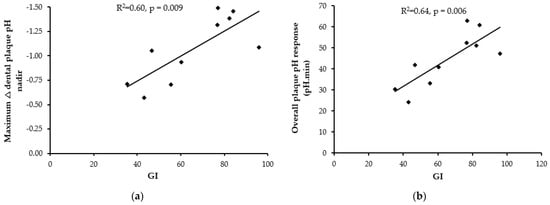Linear correlation between GI of starchy foods tested in sub-study 2 (n = 4 foods) and sub-study 3 (n = 6 foods) and maximum nadir decrease in dental plaque pH at 22 min (a) or overall plaque pH response over 62 min (b). Each data point represents the average response in 12 healthy participants.