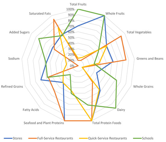 In 2017–2018, schools received the maximum score for total fruits, whole fruits, and dairy, as indicated by the data points at the outermost edge of the radar plot axis. Schools scored significantly higher than stores, full-service restaurants, and quick-service restaurants for total fruits (all p < 0.0001), and they scored significantly higher than both types of restaurants for whole fruits (both p < 0.0001), but no differences were observed between schools and stores for whole fruits, as stores also received the maximum score. Schools also scored significantly higher than the three other food outlets for dairy (all p < 0.0001). The score for schools for whole grains was 7.24 out of 10 points, which fell short of meeting the Dietary Guidelines but was significantly higher than all three other food outlets (all p < 0.0001). Similarly, the added sugars score for schools was 8.43 out of 10 points, also significantly higher than the three other outlets (stores p < 0.0001, full-service restaurants p = 0.031, quick-service restaurants p = 0.001). The relatively high scores for whole grains and added sugars contributed to the total score of 65/100 points. Although a total score of 65 points translates to a “D” on the graded scale, it was significantly higher than the “F” received for both types of restaurants (full-service: 51 points, p < 0.0001; quick-service: 39 points, p < 0.0001). Despite scoring higher than the other types of food outlets for many component scores, schools generally scored lower for total protein foods and seafood and plant proteins, receiving scores of 3.57 and 2.52 for total protein foods and seafood and plant proteins, respectively. This total protein foods score was significantly lower than all other outlets (all p < 0.0001), and the seafood and plant proteins score was significantly lower than stores and full-service restaurants (both p < 0.0001).