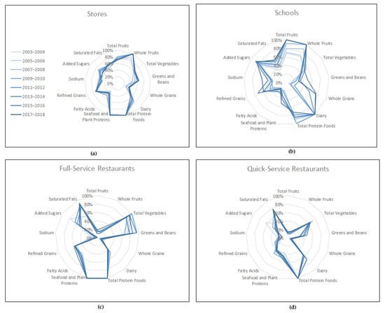 Differences in HEI-2015 component scores over time by food outlet type. (a) HEI-2015 component scores for stores; (b) HEI-2015 component scores for schools; (c) HEI-2015 component scores for full-service restaurants; (d) HEI-2015 component scores for quick-service restaurants. On the radar plots, the center point of the graph represents a score of zero, and the outer point of each axis represents the maximum score for each component. Therefore, plots with most points closer to the outer edge represent a food pattern that is closer to meeting the recommendations of the 2015–2020 DGA than a plot with many points closer to the center of the graph. Additional information on HEI visualization and radar plots can be found on the NCI website and the HEI-2015 update paper [10,34].