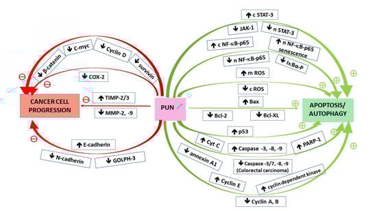 Effect of punicalagin on signaling pathways components associated with cancer cells development. The red and green arrows indicate the effect of particular compounds on either cancer cells progression or apoptosis/autophagy. Upwards and downwards arrows beside a given compound indicate positive or negative impact of a given compound on either cancer cells progression or apoptosis/autophagy. Abbreviations: GOLPH-3 = golgi phosphoprotein 3; MMP2/9 = matrix metalloproteinases 2 and 9; PARP(−1) = poly(ADP-ribose) polymerase (1); TIMP2/3 = tissue inhibitors of metalloproteinases 2 and 3; letters “c”, “n”, and “m” denote subcellular localization; cytosolic, nuclear, and mitochondrial, respectively.