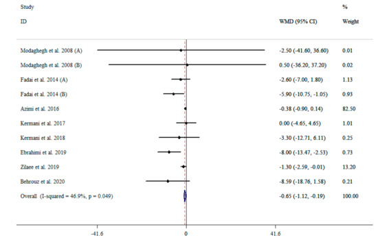 The results of the pooled data from ten effect sizes [37,38,39,40,41,42,43,44] indicated that saffron supplementation reduced SBP (WMD: −0.65 mg/dL; 95% CI: −1.12 to −0.18, p = 0.006) compared with placebo, with moderate heterogeneity (I2 = 46.9%, p = 0.049) (Figure 2). Moreover, subgroup analysis showed that the saffron supplementation reduced SBP in all of the subgroups, except in those who had elevated SBP (>120 mmHg) (WMD: −0.47 mmHg; 95% CI: −0.98 to 0.03, p = 0.068) (Table 2).