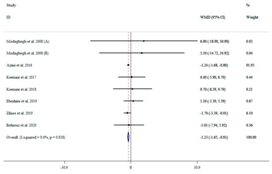 Analysis of the eight effect sizes [37,39,40,41,42,43,44] indicated that saffron supplementation significantly reduced DBP (WMD: −1.23 mmHg; 95% CI: −1.64 to −0.81, p < 0.001) without significant heterogeneity (I2 = 0.0%, p = 0.928) (Figure 3). However, subgroup analysis showed that saffron supplementation could reduce DBP in participants with a baseline DBP ≥ 80 mmHg (WMD: −1.26 mmHg; 95% CI: −1.68 to −0.84, p < 0.001), in intervention durations less than 12 weeks (WMD: −1.25 mmHg; 95% CI: −1.68 to −0.83, p < 0.001), at dosages ≥100 mg per day (WMD: −1.23 mmHg; 95% CI: −1.65 to −0.81, p < 0.001), and interventions with crocin (WMD: −0.38 mmHg; 95% CI: −5.89 to 5.13, p < 0.001) (Table 2).