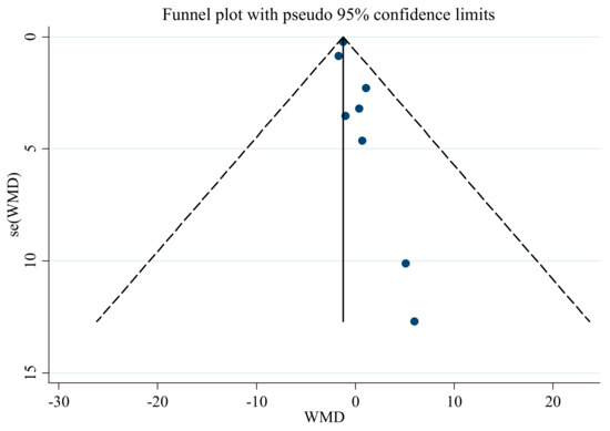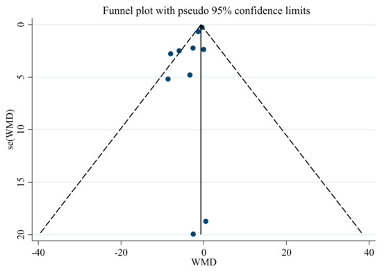 Publication bias assessment, using Egger’s regression test and an asymmetric funnel plot, showed no evidence of publication bias (Table 3) in the meta-analysis regarding the influence of saffron supplementation on SBP (p = 0.543). Nevertheless, there was significant publication bias for DBP (p < 0.001), with funnel plots indicating the same result (Figure 8 and Figure 9). Therefore, we conducted a trim and fill analysis for SBP. The results showed that when the publications reach 12, the publication bias changes significantly, but the overall results do not vary (WMD: −1.26 mmHg, CI: −1.67, −0.84; p < 0.001).