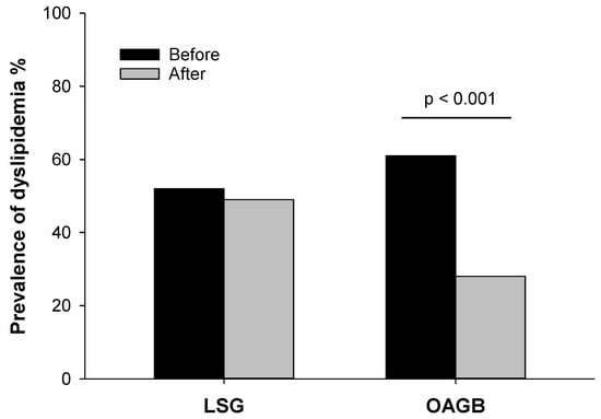 Figure 1 represented the difference in the prevalence of dyslipidemia after LSG (before surgery 52%, after surgery 49%, p = 0.763) and OAGB, showing a statistically significant slowing only after OAGB (before surgery 61%, after surgery 22%, p < 0.001).