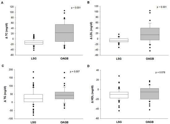 Difference between the changes (delta Δ) of Total Cholesterol (TC) (A), triglycerides (TG) (B), Low Density Lipoprotein-cholesterol (LDL) (C) and High Density Lipoprotein -cholesterol (HDL) (D) before and after Laparoscopic Sleeve Gastrectomy (LSG) and One Anastomosis Gastric Bypass (OAGB). Statistical analysis was performed by Mann-Whitney Rank Sum Test for the comparison between delta; multiple regression model for the adjustment for Δ BMI, sex and age.