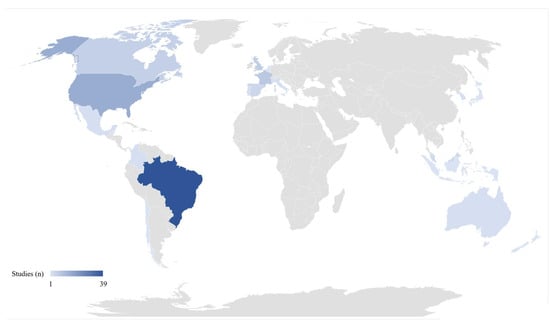 The number of studies performed in different countries is reported in Figure 2. As shown, Brazil had the highest number of studies (n = 38), followed by the United States (n = 15), France (n = 8), the United Kingdom (n = 6), Canada (n = 6), and Spain (n = 4). Fewer studies were performed in Malaysia, (n = 3), and in other countries such as Mexico, Italy, Australia, Korea, and Portugal (n = 2); only one study each was conducted in Chile, Japan, Indonesia, Lebanon, Israel, the Netherlands, Colombia, Belgium, and New Zealand.
