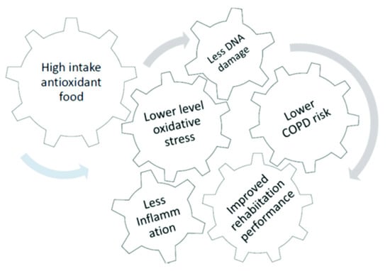 Considerable evidence in literature support a crucial role of oxidative stress and associated inflammation in COPD patients; indeed, if compared to healthy subjects, COPD patients had a significant increase in markers of oxidative stress and ROS-induced DNA damage [4,5]. Specifically, oxidative stress occurs when free radicals (reactive oxygen and nitrogen species) exceed the availability of antioxidants, thus causing pathological reactions responsible for numerous diseases, including respiratory ones, and in particular, COPD. Elevated ROS production is directly responsible for increased in lipid peroxidation products (MDA), DNA damage, and the onset of inflammation. The interplay between oxidative stress, oxidative DNA damage, and inflammation, how these events are associated with the success of rehabilitation, and the role of dietary intake of antioxidants is summarized in Figure 1 and is the aim of this study.