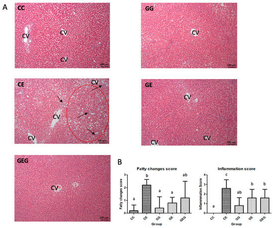 Hepatic fatty changes and inflammatory scores were significantly elevated in the CE group, while those scores were significantly lower in the GE and GEG groups (Table 4). According to the hepatic histopathology, steatosis and inflammatory cell infiltration were observed in the CE group (Figure 1).