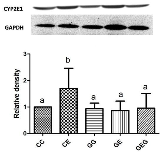 As shown in Figure 2, CYP2E1 protein expression was significantly increased in the CE group compared to the CC group. Moreover, there was no difference among ethanol-intake groups, i.e., CE, GE, and GEG groups.