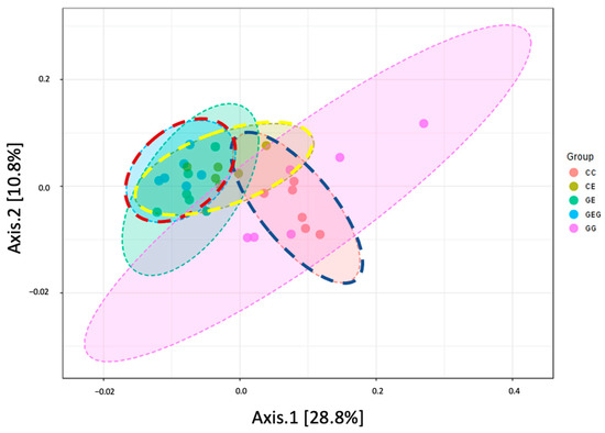 Effects of glutamine on principal coordinate analysis (PCoA) plot of bacterial distribution in chronic ethanol-fed rats. The CC group was fed the control diet for 8 weeks; the GG group was fed a glutamine-containing diet for 8 weeks; the CE group was fed the control diet the first 2 weeks and then an ethanol-containing diet for the next 6 weeks; the GE group was fed a glutamine-containing diet the first 2 weeks and then an ethanol-containing control diet for the next 6 weeks; the GEG group was fed a glutamine-containing diet for the first 2 weeks, and then a glutamine-containing diet with ethanol for the next 6 weeks.