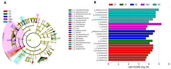 To identify changes in specific bacterial taxonomical abundances between groups, a linear discriminant analysis effect size (LEfSe) approach and linear discriminant analysis (LDA) score were assessed in this study (Figure 6). It was found that the Erysipelotrichi class, Erysipelotrichales order, Erysipelotrichaceae family, Streptococcus genus and Anaerostipes genus of the Firmicutes phylum were commonly found in CC fecal samples. Other groups of bacteria were also abundant in the CC group including the Desulfovibrio genus and Shigella sonnei species from the Proteobacteria phylum. Moreover, the Rhizobiales order, Lactobacillus family, and Klebsiella genus were overrepresented in the GG group. At the species level, Lactobacillus reuteri, Enterobacter arachidis, and Rothia nasimurium species also had higher LDA scores in the GG group. In the CE group, the Providencia genus of the Proteobacteria phylum and Corynebacteriaceae class of the Actinobacteria phylum were commonly observed. In contrast, distinct microbes were also found in the GE and GEG groups. In the GE group, the Peptococaceae class of the Firmicutes phylum and Bifidobacterium animalis species of the Actinobacteria phylum were dominant bacteria. In contrast, the Bacillaceae family, Clostridia class, and rc4_4 genus were overrepresented in the GEG group which belong to the Firmicutes phylum.