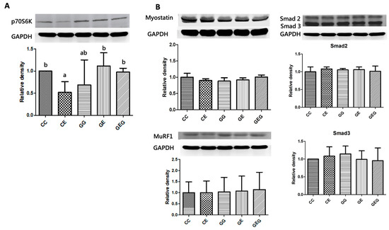 Final BWs and relative liver weights are shown in Table 2. Compared to the CC group, the final BW of the CE group was significantly lower (p < 0.05). However, there were no differences among the CE, GE, and GEG groups. The relative liver weight of the CE group was significantly higher than that of the CC group, but there were no differences among the ethanol-fed groups (Table 2). Furthermore, no change was observed in muscle weights, for either the quadriceps or gastrocnemius, among the groups (Table 2).