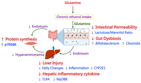The prophylactic effects of glutamine supplementation on improving muscular protein synthesis in chronic ethanol-fed rats. (1) In this study, it was indicated that glutamine improved the protein synthesis in muscle tissue when rats were fed with an ethanol-containing diet. (2) The improvement of muscular protein synthesis by glutamine may be due to three major pathways. First, when rats chronically ingested ethanol, glutamine reduced blood endotoxin level by maintaining the intestinal permeability and well-balanced microbiota composition, which inhibited muscle damage. Secondly, glutamine inhibited the elevation of blood ammonia level because ethanol-induced liver injury was ameliorated. Lastly, glutamine regulated the amino acid metabolism both in the liver and muscle.